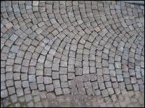 Firma Menner Oberrimsingen Bvh. Freiburg Sedanstraße gebrauchtes Basalt- u. Porphyr- Kleinpflasterin Segmentbogen auf Brechsand und Beton Verfugung mit Brechsand und Adorit
